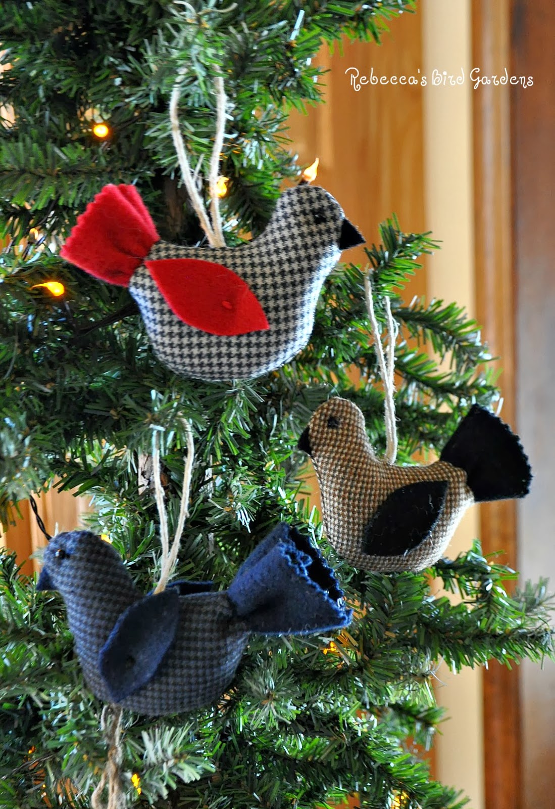 Birdhouses, metal birds, and up-cycled ornaments made of re-purposed wool coats and jackets!