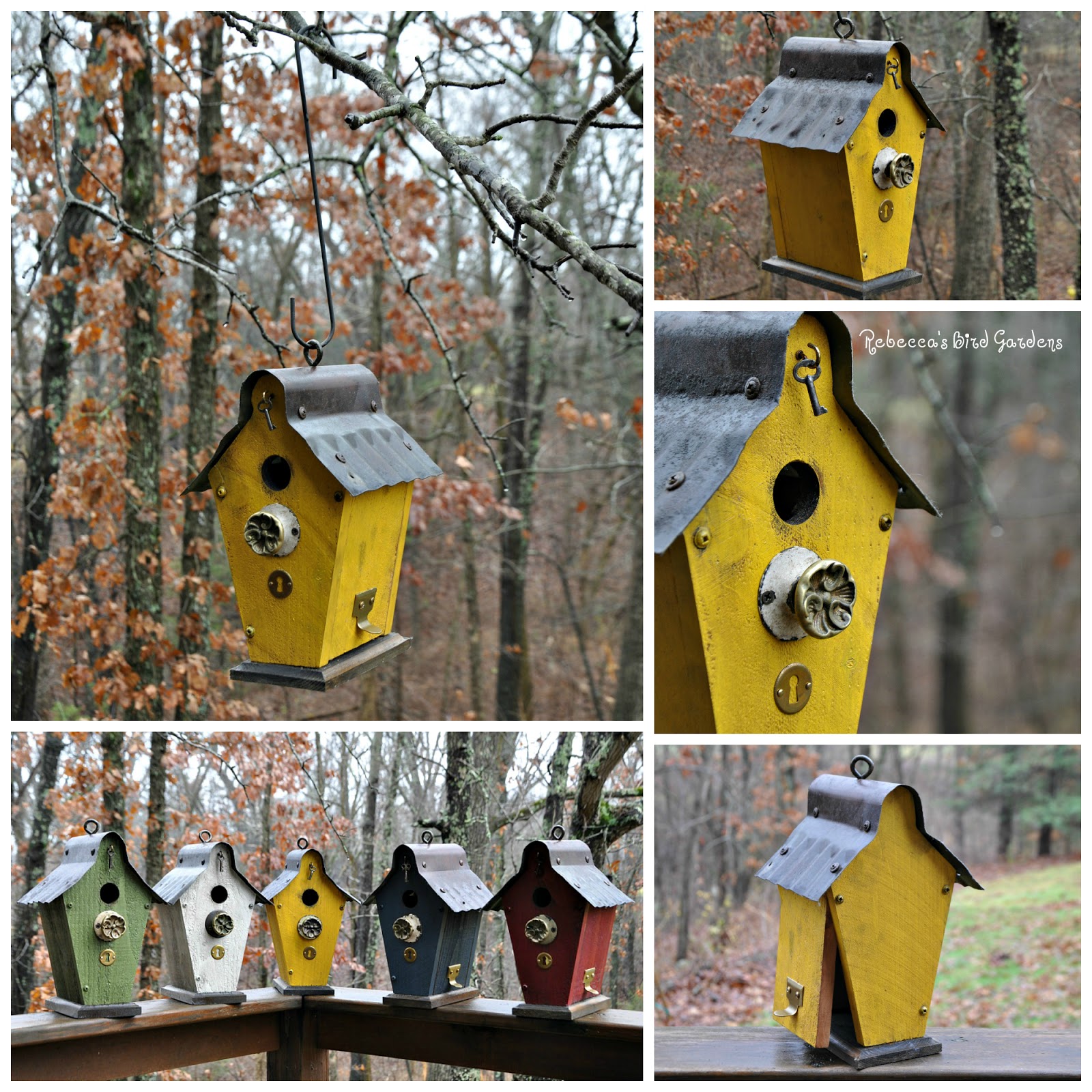 Weathered barn tin, vintage hardware, antique key! Entrance hole size is 1 1/4" - suitable for wrens, chickadees, nuthatches and titmice. ♥ Several colors to choose from in the Etsy shop!