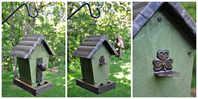 Love these feeders just listed in the Etsy shop! I'm calling this one "The Irish Pub" The top (roof) lifts up to fill the feeder with birdseed. - Hangs from attached wire.~ Weathered barn tin, vintage hardware - the perch on the back of the feeder is an antique "shamrock" carpet clamp.