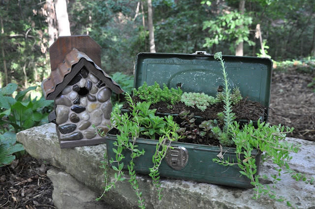 Rock cottages and tackle boxes planted with a variety of sedums...