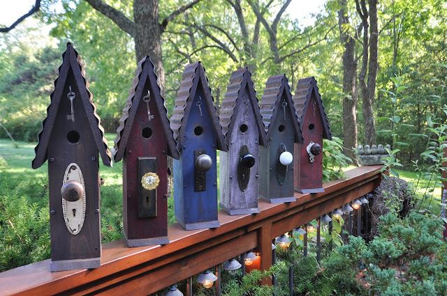 Lucky Irish birdhouses! - In the Etsy shop now. - The perch is an antique "shamrock" carpet clamp.